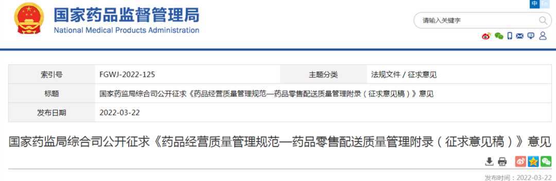 3月22日,国家药监局发布了公开征求《药品经营质量管理规范—药品零售配送质量管理附录(征求意见稿)》意见。